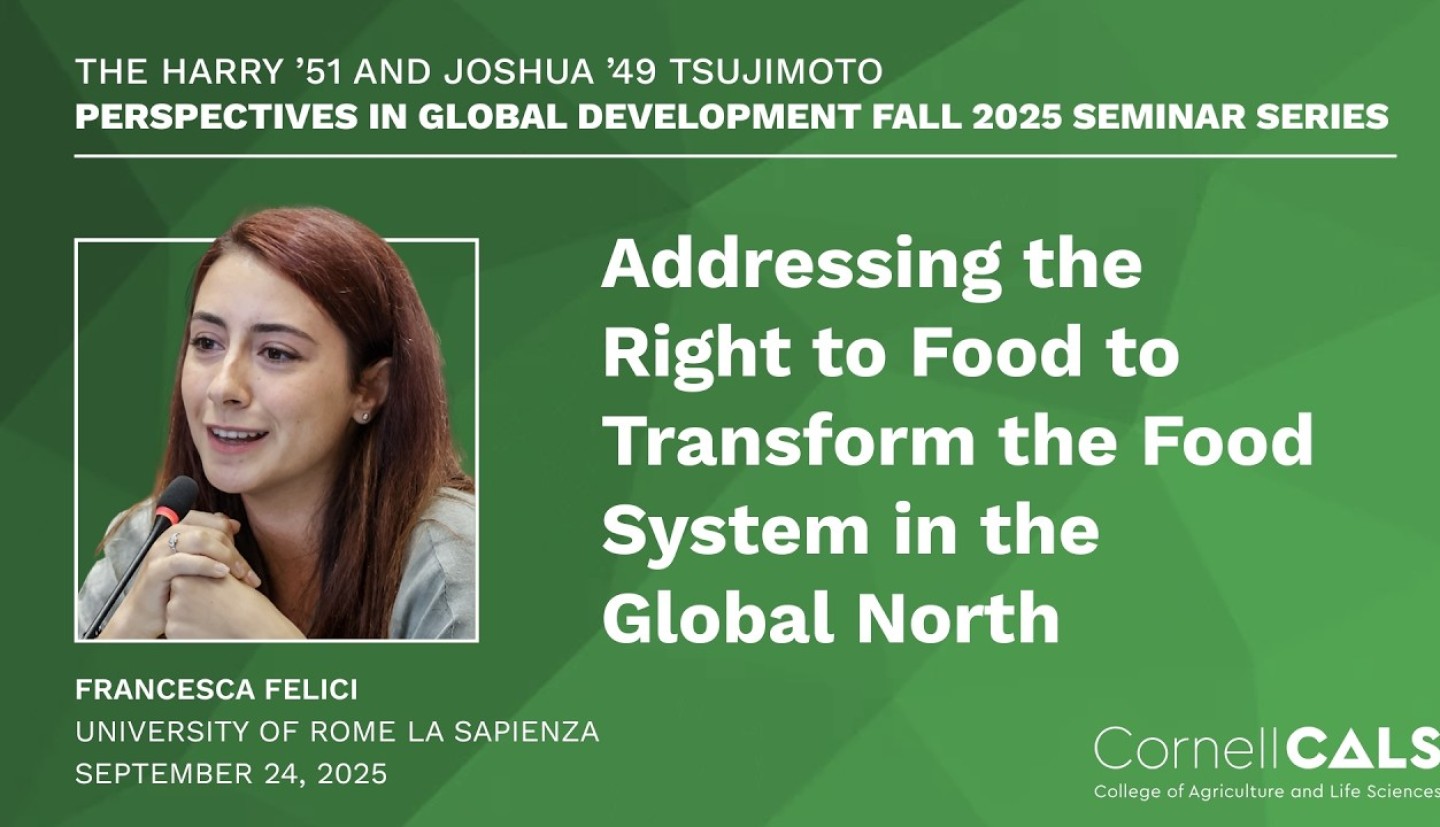 The series is co-sponsored by the Department of Global Development, the Department of Natural Resources and the Environment, and the Charles H. Dyson School of Applied Economics and Management as part of courses GDEV 4961, AEM 4961, NTRES 4961, GDEV 6960, AEM 6960, and NTRES 6960.