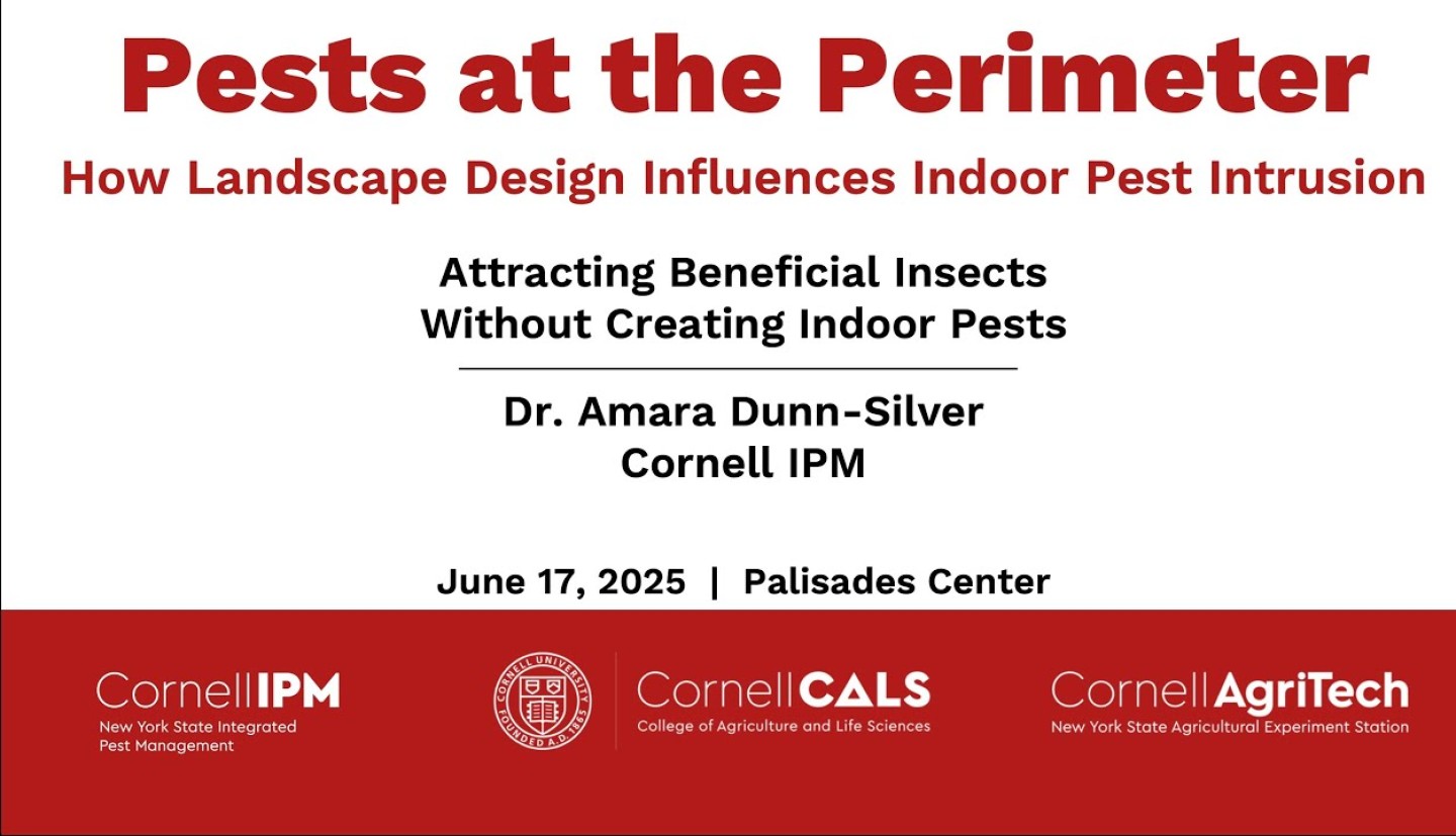 This session is part of the Cornell IPM Annual Conference: Pests at the Perimeter – How Landscape Design Influences Indoor Pest Intrusion. The 2025 conference focuses on how landscape composition and management around buildings influence the intrusion of pests. Experts will share science-based strategies to manage environments around buildings, reducing pest intrusion. This event offers practical insights for landscape and pest management, ideal for Master Gardener Volunteers, educators, pest management professionals, and community members.