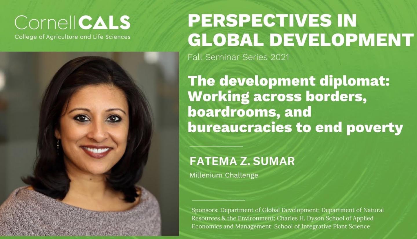 The Perspectives in Global Development seminars are held Wednesdays from 12:25 – 1:15 p.m. eastern time during the semester. The series will be presented in a hybrid format with some speakers on campus and others appearing via Zoom. Students, faculty and the general public are welcome to attend. The series is co-sponsored by the Department of Global Development, the Department of Natural Resources and the Environment, the Charles H. Dyson School of Applied Economics and Management, and the School of Integrative Plant Science as part of courses IARD 6960, NTRES 6960, PLSCS 6960 and AEM 6960.