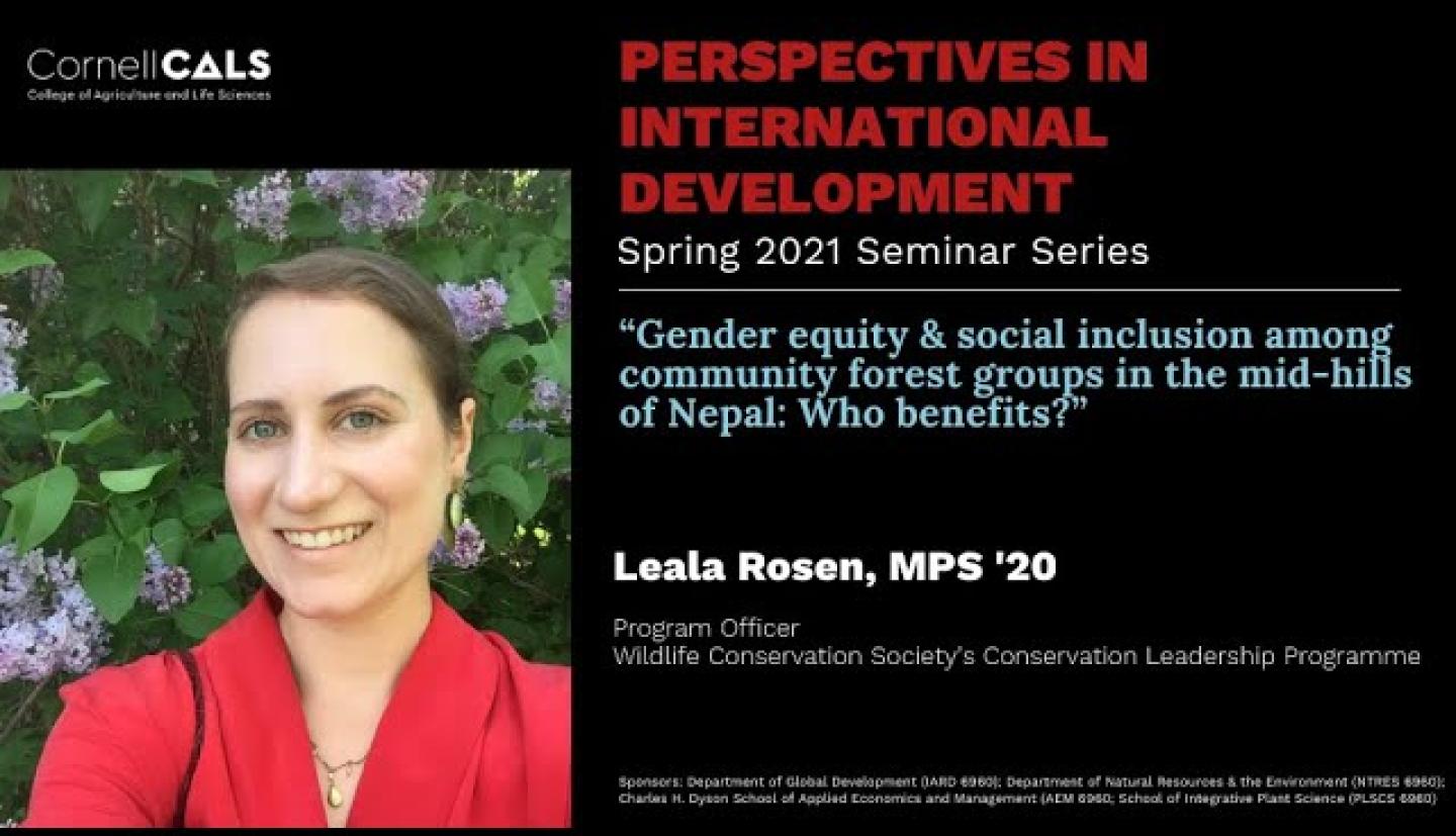 Community forestry programs in Nepal have been incredibly successful in terms of carbon sequestration, reforestation, and localized environmental conservation practices. The decentralized governance model of Nepal’s community forestry initiatives has been replicated in several other developing countries, and there are numerous environmental benefits. However, the role of gender equity and social inclusion among these groups is unclear. Although substantial efforts in terms of gender mainstreaming and social inclusion initiatives have been undertaken and women participate in and lead community forest user groups (CFUGs), barriers to group entry limit social inclusion. This talk presents a case study of community forest user groups in Nepal in order to highlight the need to discuss gender equity and social inclusion as two different - yet often intersecting - components international development programs, rather than as one unit – gender equity & social inclusion (GESI). This research was conducted as part of an MPS degree completed in August 2020, with generous funding from AWARE and Engaged Cornell.
