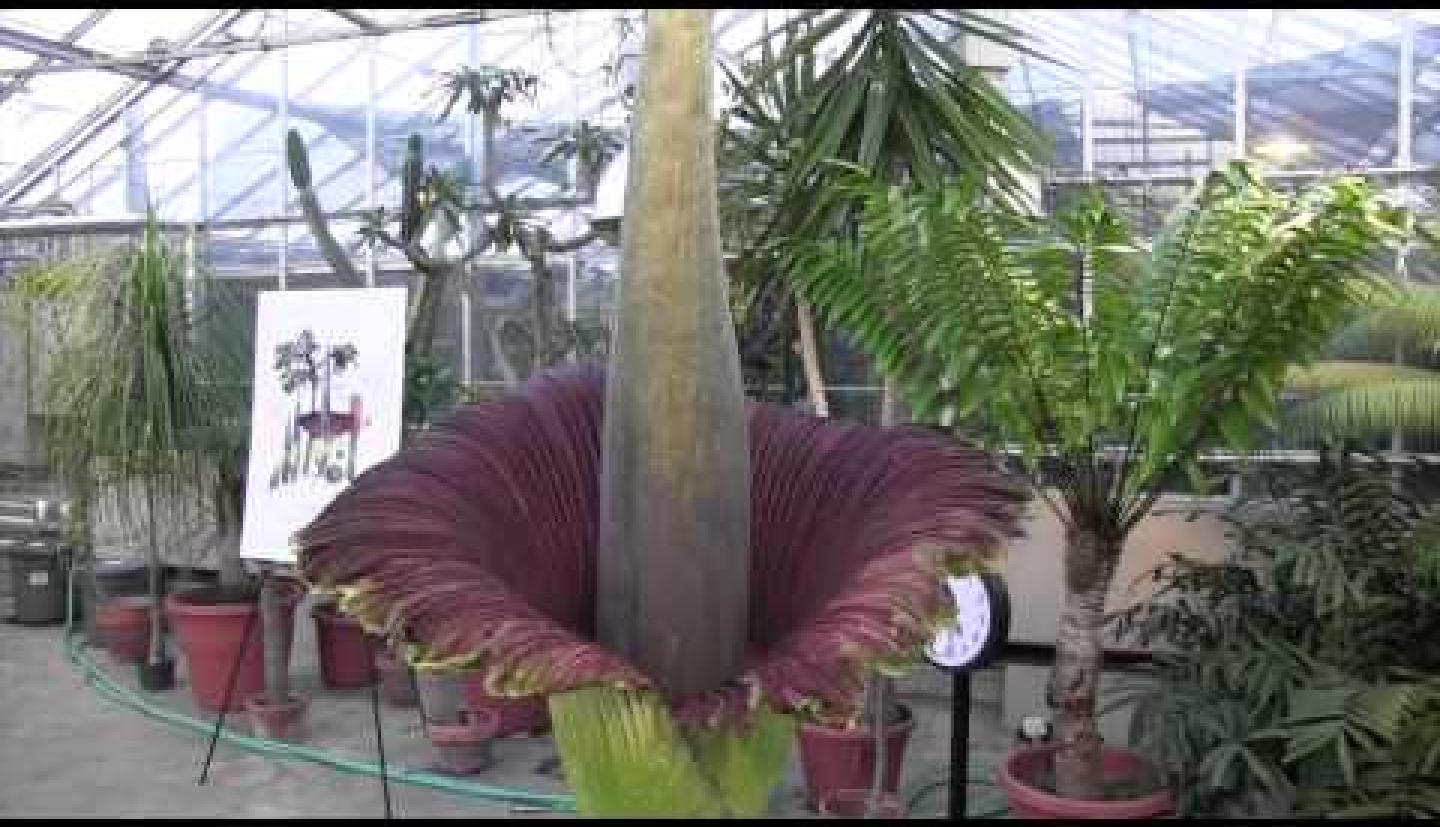 Titan arums, native to the sweltering tropical forests of Sumatra, produce the largest unbranched inflorescences in the plant world, reaching heights more familiar to the tallest professional basketball players. They have captured the fascination of the public around the world for their huge size and extraordinary reproductive strategy: When flowering, the plants create high heat, and produce purple coloring and strong odors that mimic rotting flesh, to attract pollinating insects that feed on carrion.