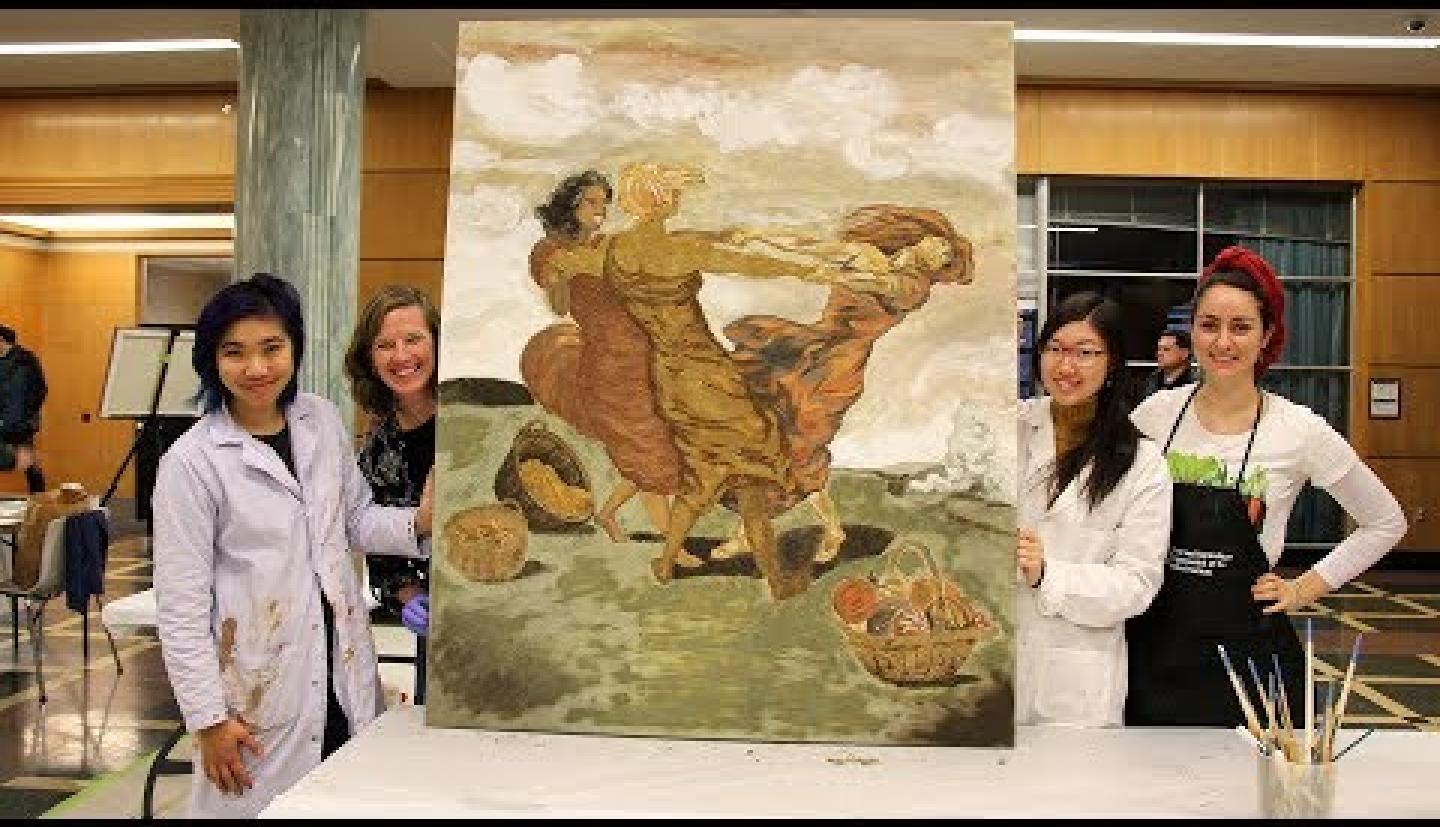 On the main canvas, Kurtz and artists affiliated with the School of Integrative Plant Science used soil paints to honor an agricultural practice used by Native American communities. The scene they painted was based on “Ringelreihen,” a 1910 work by the German artist Franz von Stuck, which shows three women spinning arm-in-arm.