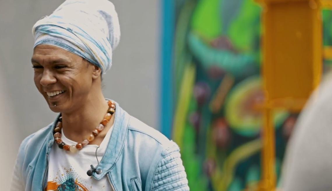 “A Dança Da Natureza” (The Dance of Nature) incorporates nature, a human figure, animals and stylistic images in bright, vivid colors that enliven the north side of the Nevin Welcome Center. The mural expresses the aura and spirit of plants, with the artist seeing and capturing the colors of nature in ways undetected by most.